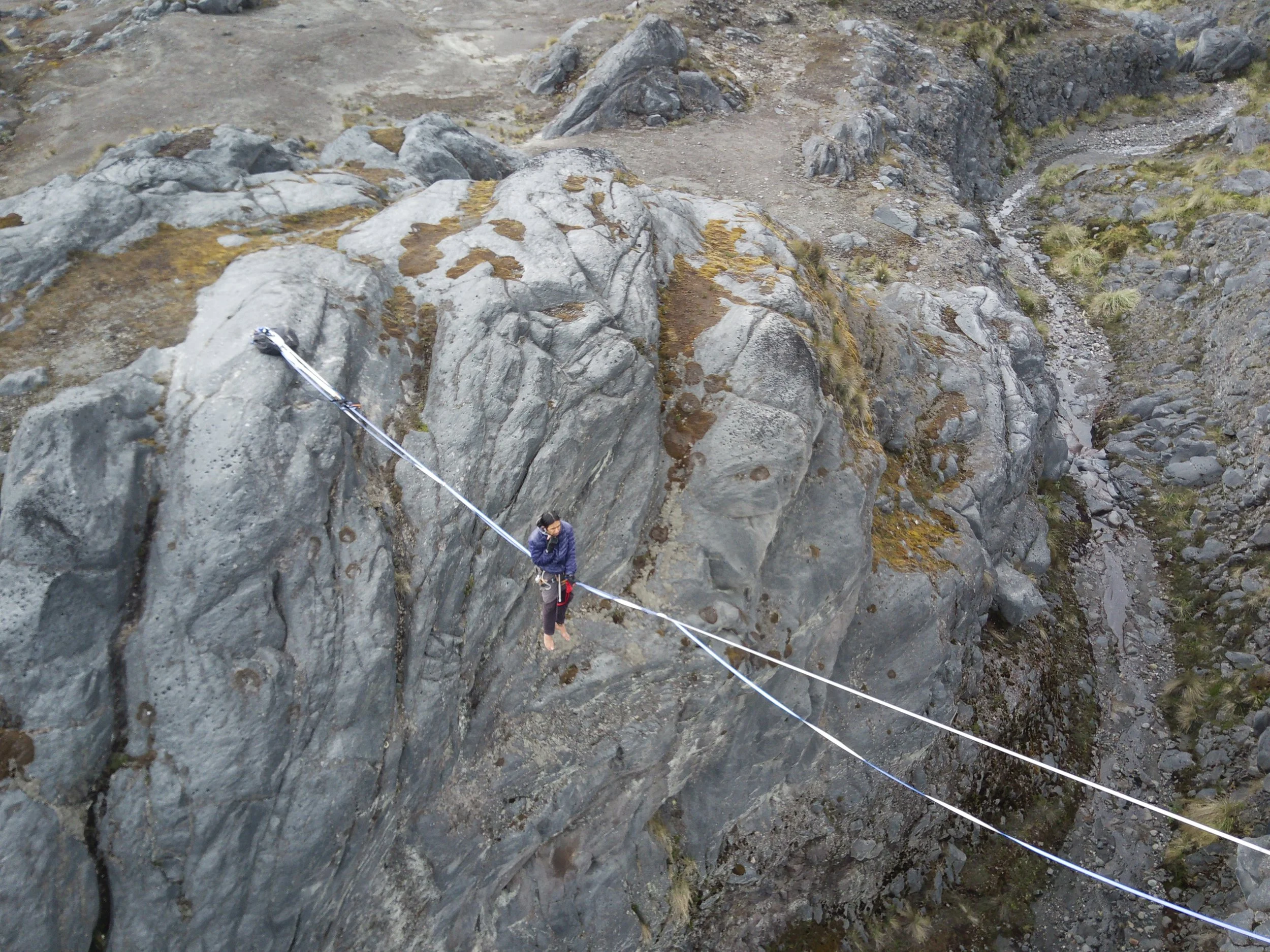 Ya había instalado mi highline un par de veces en el nuevo spot, timidamente había cruzado la linea con mi roldana y me había parado en el borde con la seguridad de un par de pajonales de colchón antes del desplome. Sin embargo nunca había visto a nadie hacer highline, de hecho nunca había visto a nadie fue de mis amigos en el parque de Manizales hacer slackline. Contacté con Felipe por medio de Facebook, un biciviajero bogotano que vivía temporalmente en pereira.
